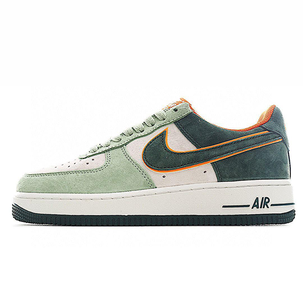 Enjoy the unique appeal and distinctive style of the Nike Air Force 1 sneakers, made of suede in a distinctive green color with orange accents.