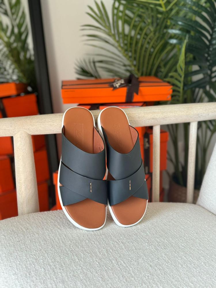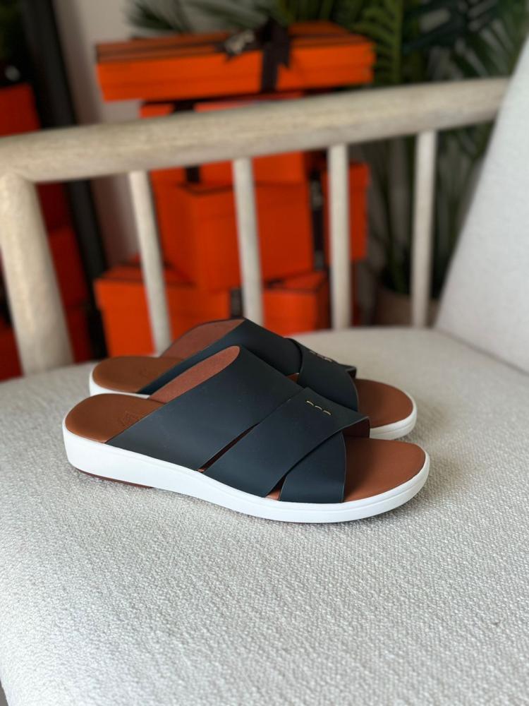 L'Orbiana luxury men's open sandal, black with honey sole