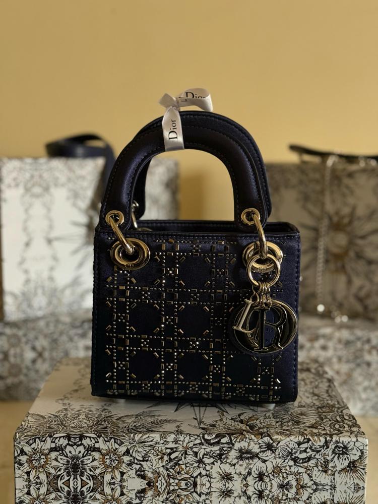 The small Lady Dior bag is crafted from luxurious leather in a rich navy blue color, embellished with shiny rhinestones that add a charming shine to the bag.