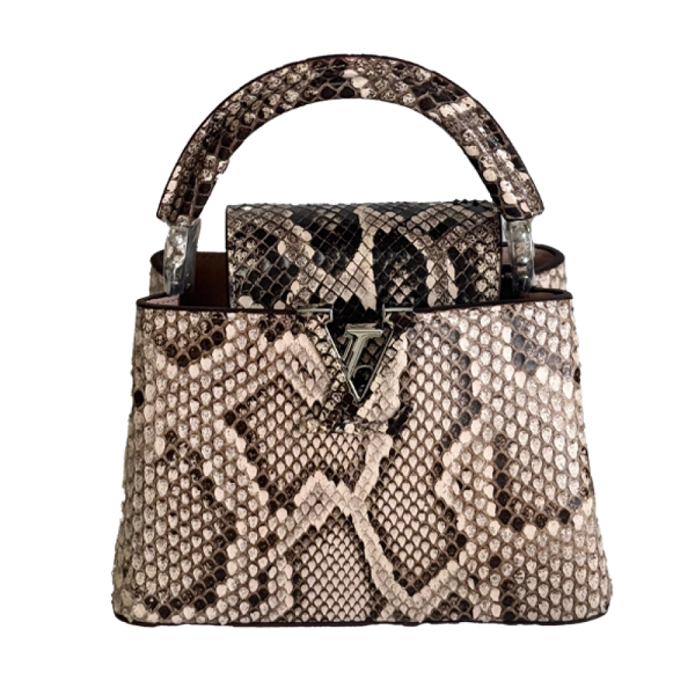 Experience luxurious elegance with Louis Vuitton's Capucine Mini bag crafted from python leather in warm beige and brown. Its compact, 21 cm design combines luxury and practicality to complement your look with a sophisticated and distinctive style, suitable for various occasions.