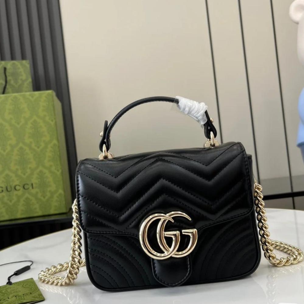 Check out this small Gucci Marmont GG bag in a chic burgundy color with a top handle and a gold chain that can be worn over your shoulder or even hung. It features the signature Gucci logo in gold, and the chevron-style striped design gives it an eye-catching touch.