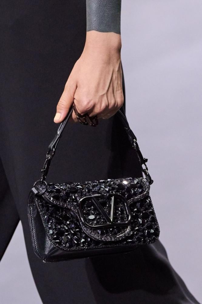 It comes in an elegant black color that adds a touch of drama and sophistication to your evening look, combining sparkle with exquisite details that reflect Valentino's exceptional elegance.