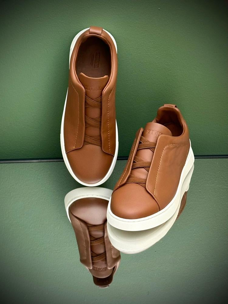 Elevate your everyday look with the Zegna Men's Triple Stitch Leather Shoe in a stylish brown color with a distinctive white sole.