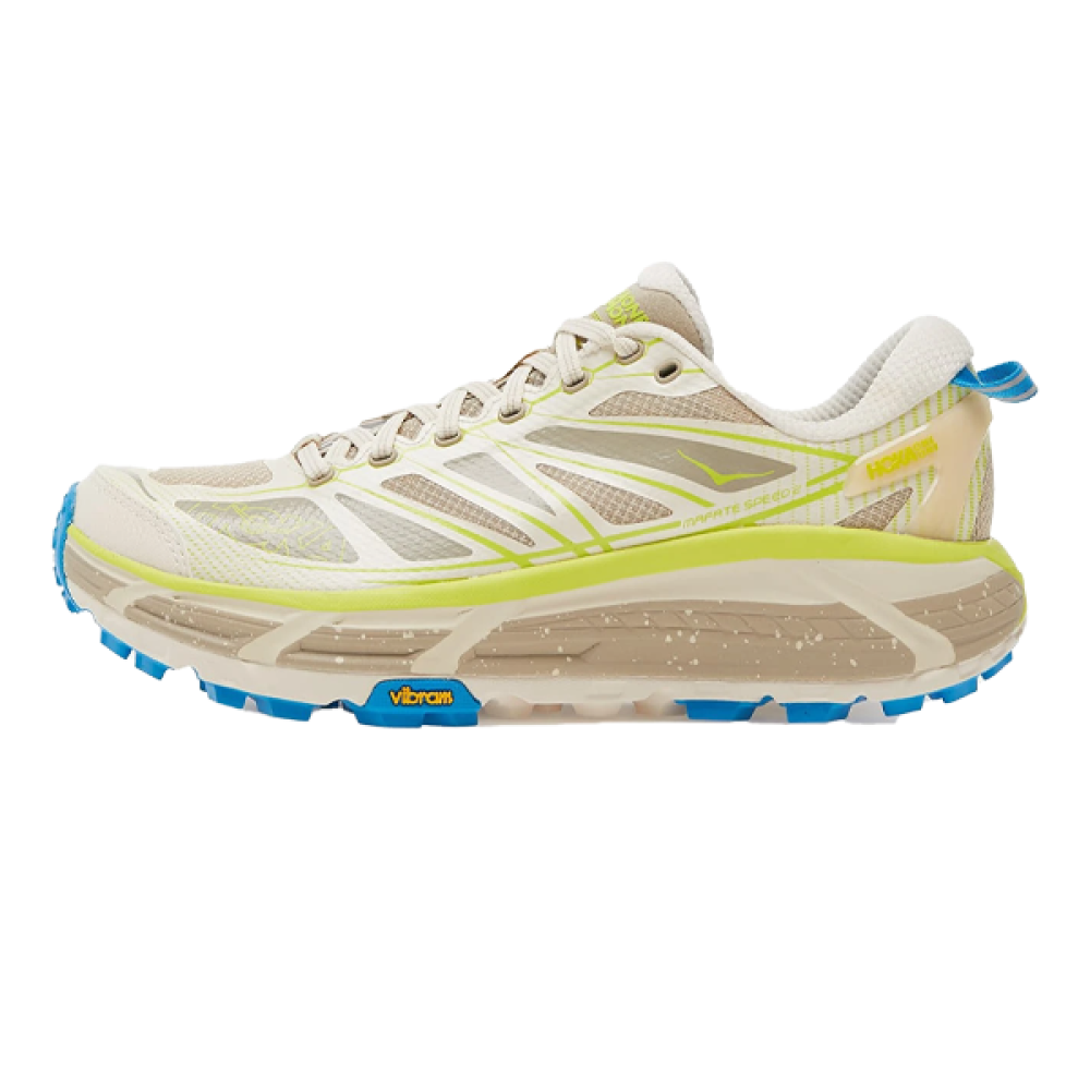 Discover superior performance and modern design with the HOKA MAFAT SEPED 2 unisex shoe, in its distinctive colorway of light beige, green, and blue.