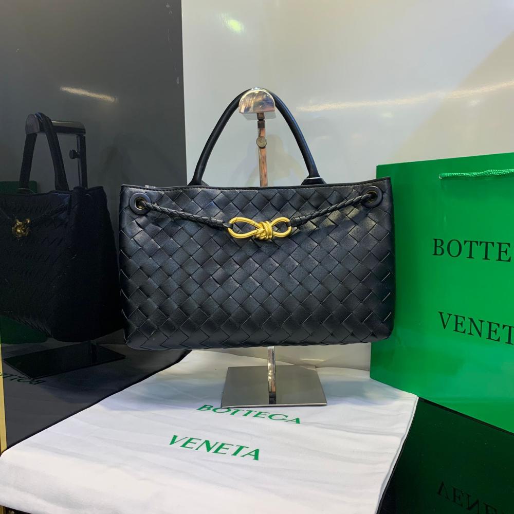 Bottega Veneta's East West Indiamo handbag in classic black is perfect for any occasion. Crafted from the brand's signature Intrecciato woven leather, it features a handy top handle for easy access and a timeless, sophisticated look.