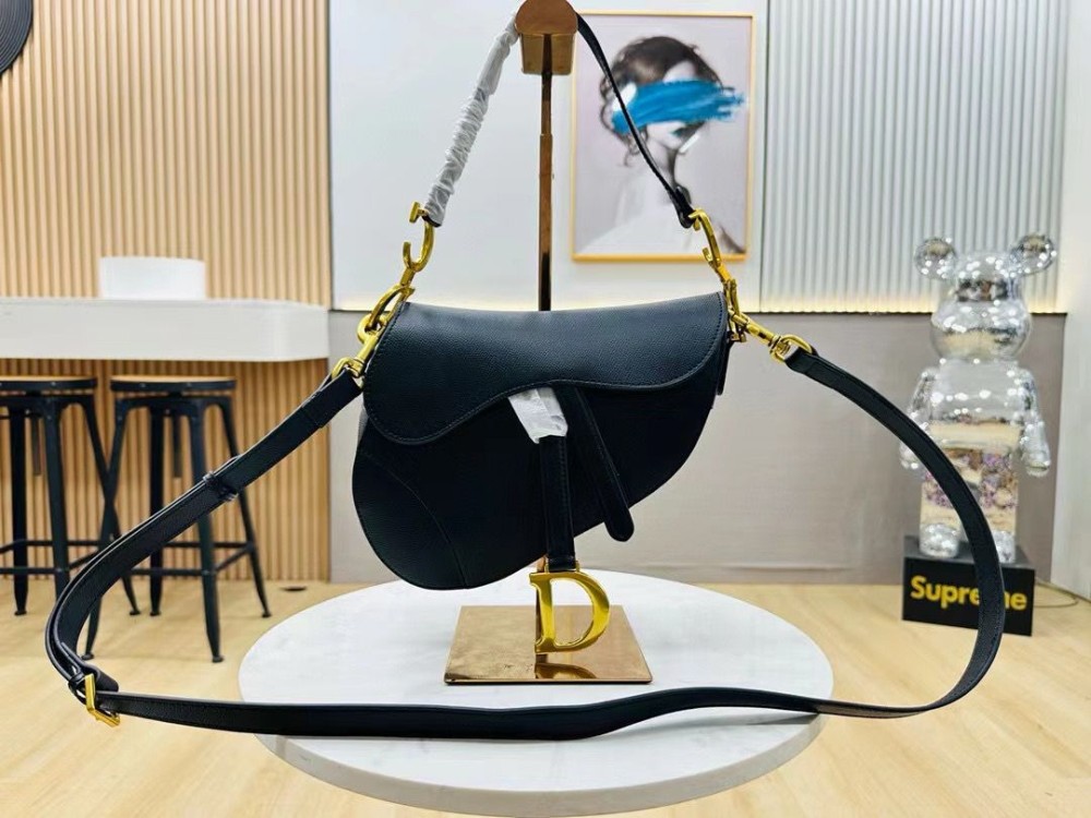 Shine with a sophisticated look with the iconic Dior Saddle bag , crafted from luxurious black grained leather and embellished with gold-tone hardware for a touch of luxury and distinction. Featuring a unique equestrian-inspired design, this bag is a must-have for the modern woman's wardrobe.