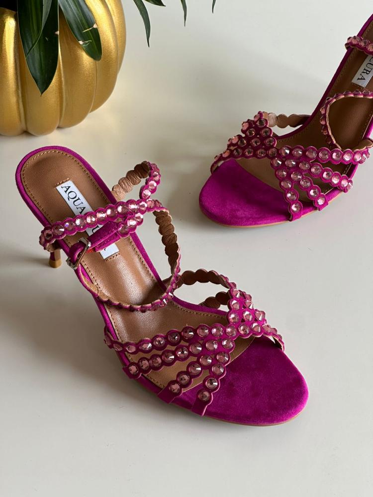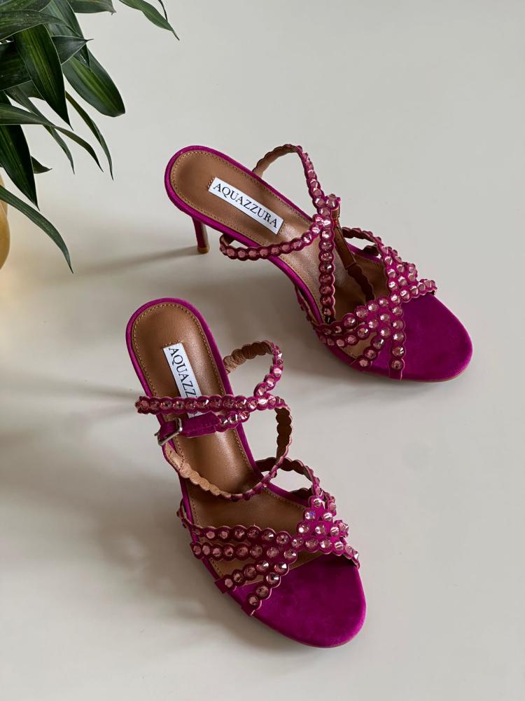 Add a touch of sparkle and color to your look with Aquazzura's fuchsia crystal-embellished sandals, and be the center of attention with every step you take.