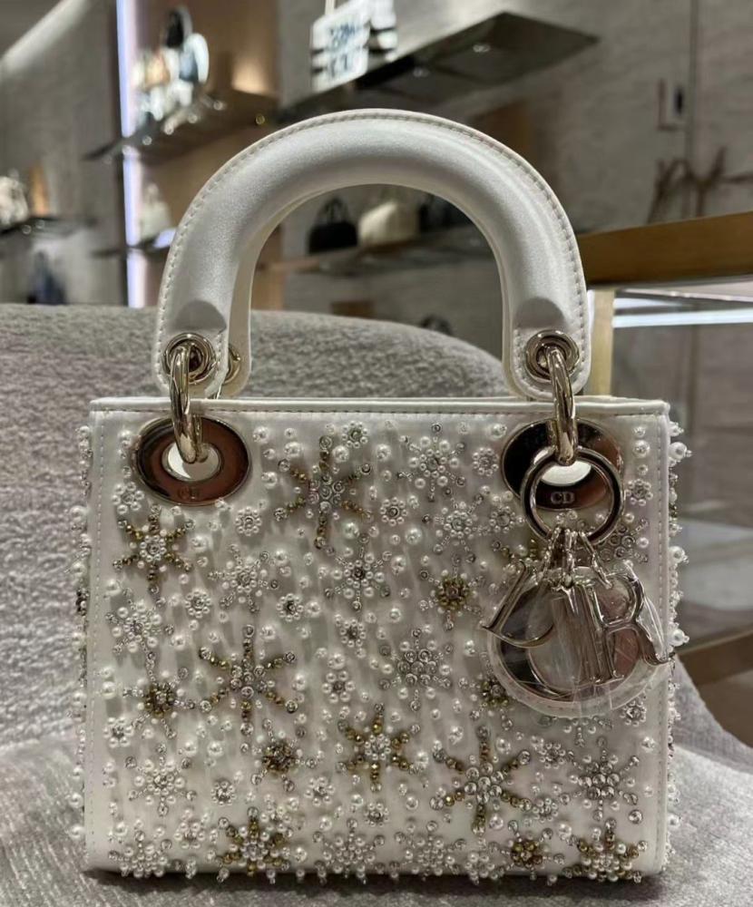This small Lady Dior handbag in white with silver rhinestone detailing and a chain is the perfect choice to add a touch of luxury and elegance to any look. The bag's design features the perfect size for all occasions, from evening events to special daily events. Its soft white design highlights its beauty with shiny rhinestone detailing that adds a touch of sparkle, while the metal chain adds a modern and luxurious look.