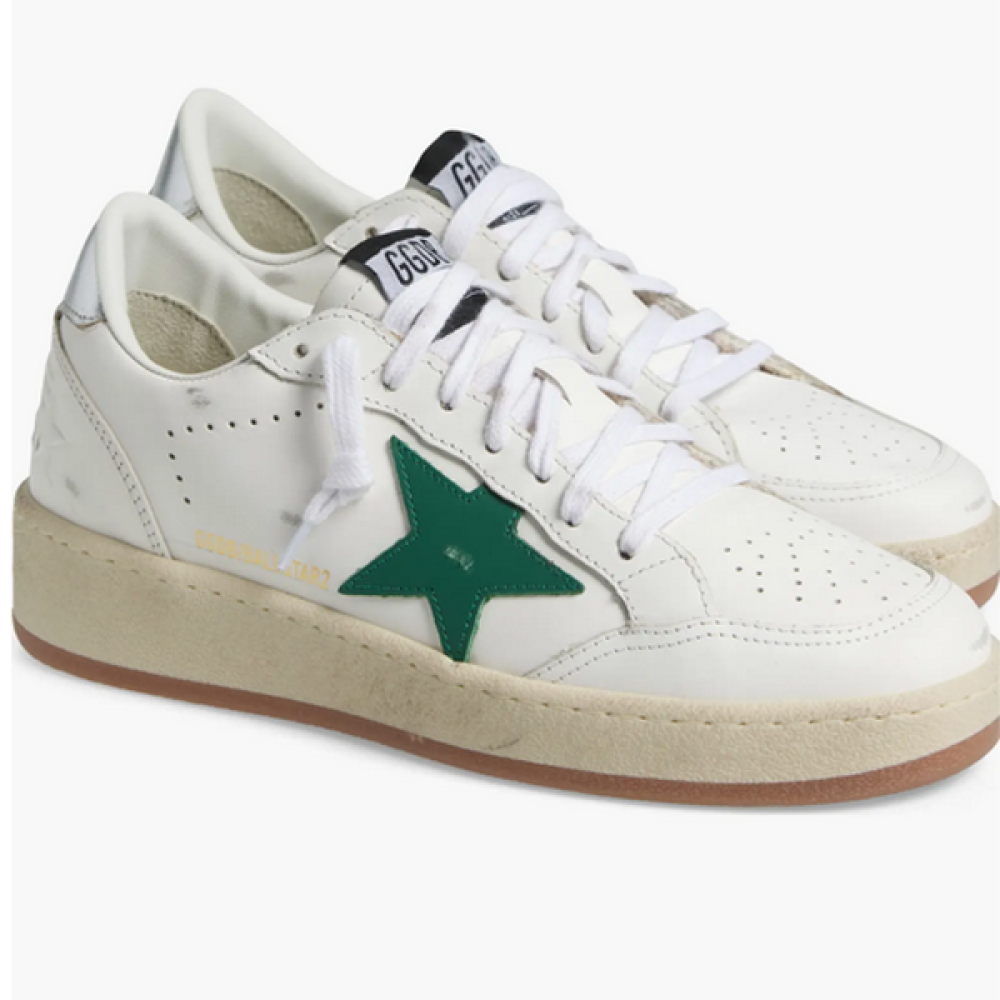 Golden Goose Ball Star white sneakers with green glitter details give you a modern look full of vitality and boldness
