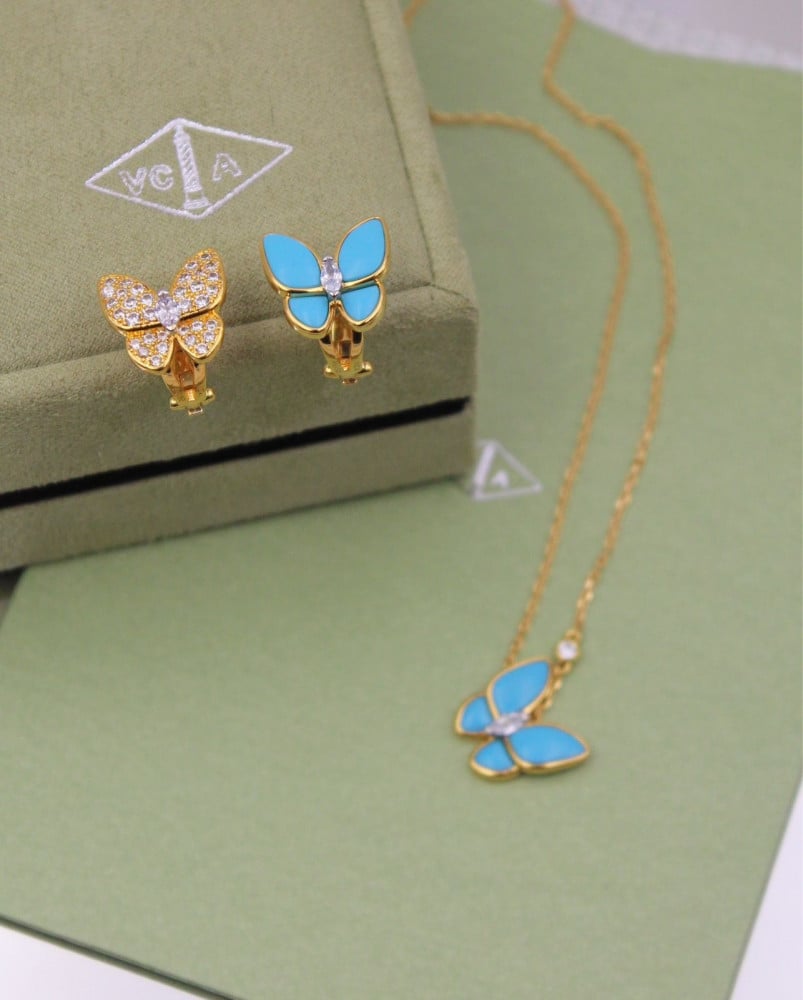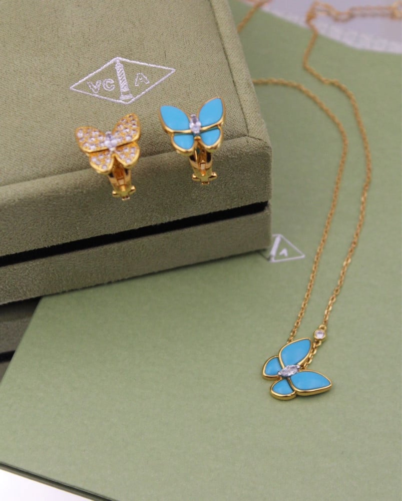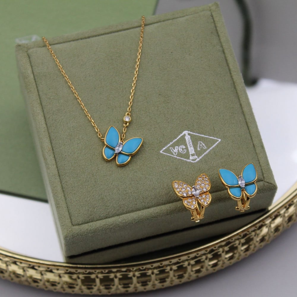 مجموعة أكسسوار فان كليف ذهبي فراشة زرقاء - طوق وأقراط