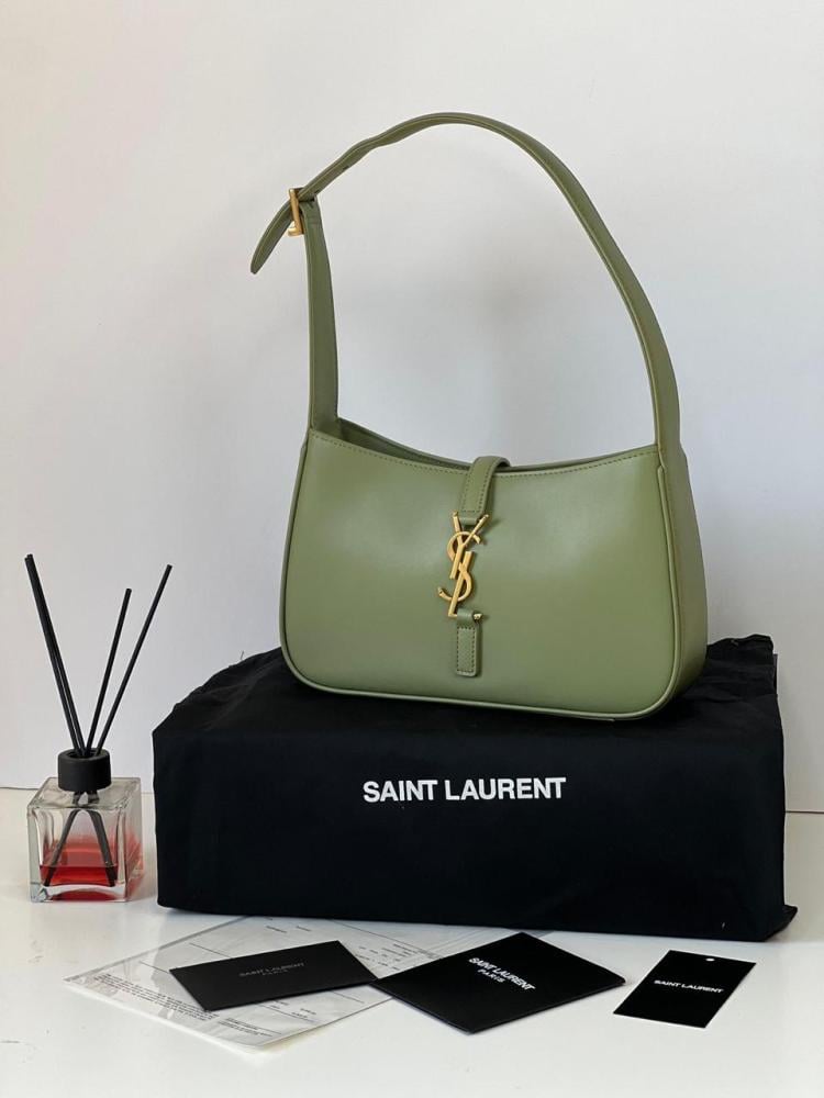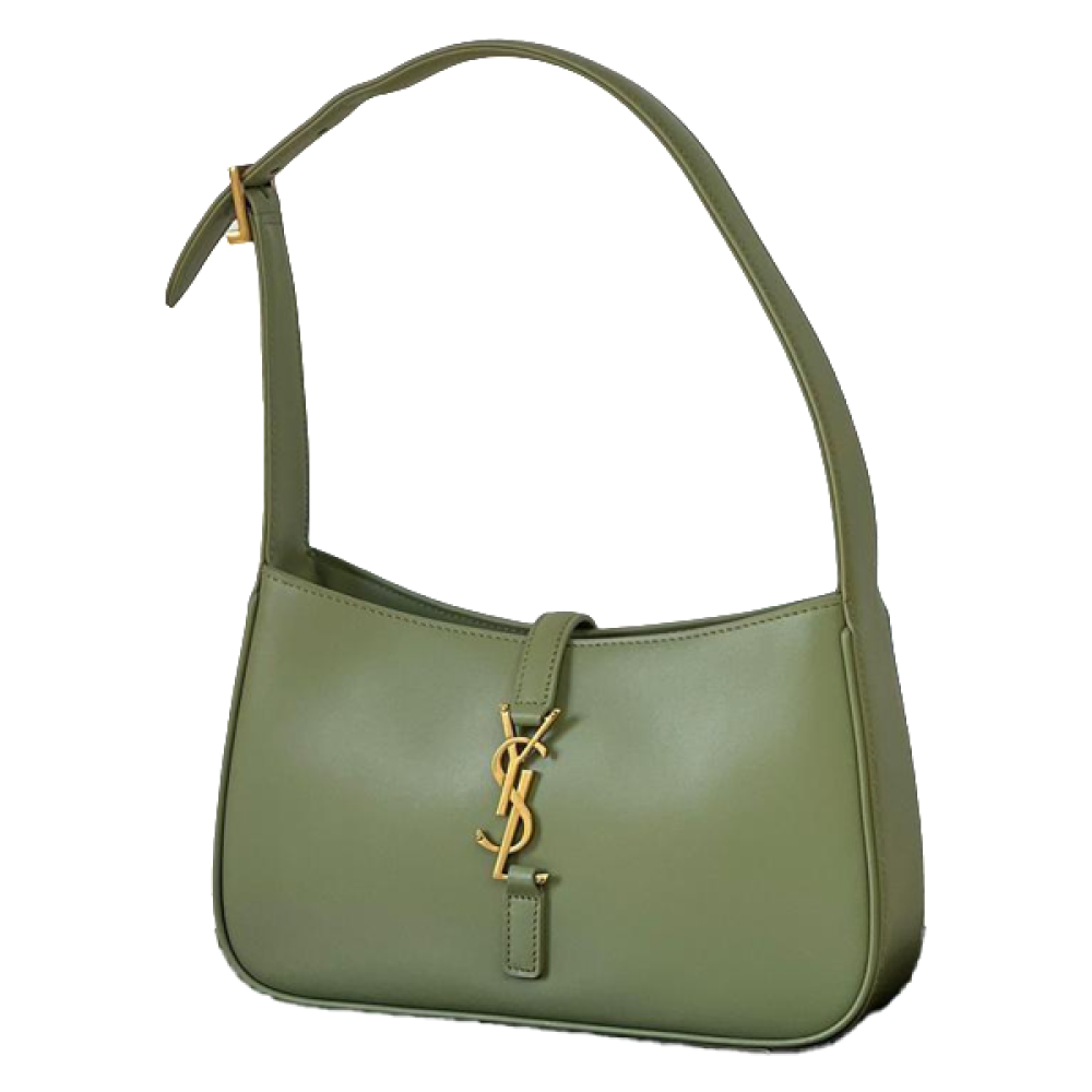 A stunning look awaits you with this small hobo shoulder bag from Saint Laurent in a charming green color, featuring a sophisticated gold logo that adds a touch of luxury.