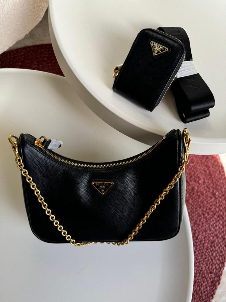 Stand out with contemporary elegance with the Prada Saffiano Re-Edition bag , measuring 23 cm, ideal for everyday essentials with a touch of luxury. This bag features an elegant black color that exudes simplicity and elegance. Its unique design comes with a metal chain that adds a modern touch to this classic style, making it the perfect choice for formal occasions and special occasions.