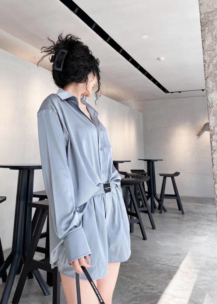 Get ready for summer in style with this women's summer set from Alexander Wang, consisting of a shirt and shorts in a distinctive blue color.