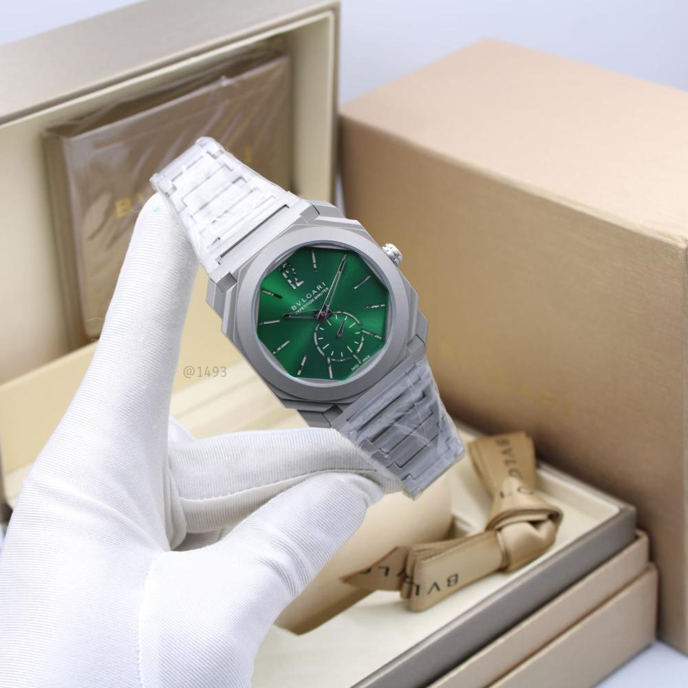 The Bulgari Octo watch is a symbol of masculinity and elegance, combining majestic gray with attractive crimson green.