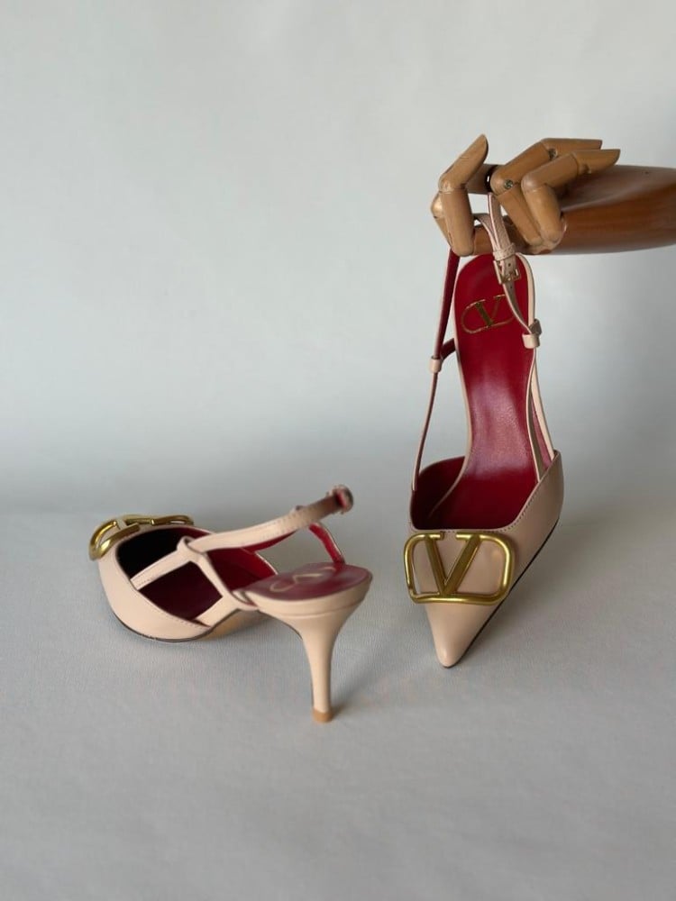 Valentino's closed-toe mid-heel sandal in beige and gold is a masterpiece that combines elegance and comfort. Featuring a closed design, this Valentino sandal adds a touch of uniqueness and elegance to your look. The upper is crafted from luxurious beige leather with a gold-tone logo, giving it a sophisticated and attractive look.