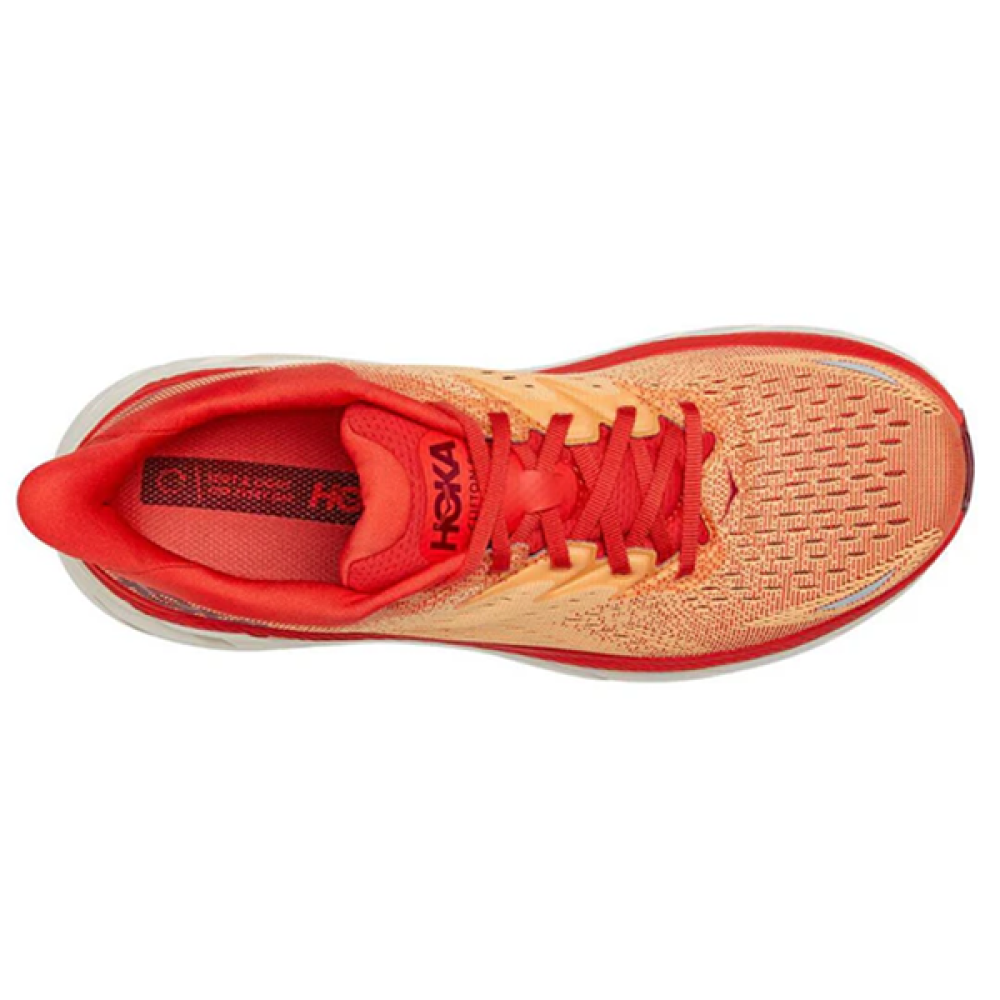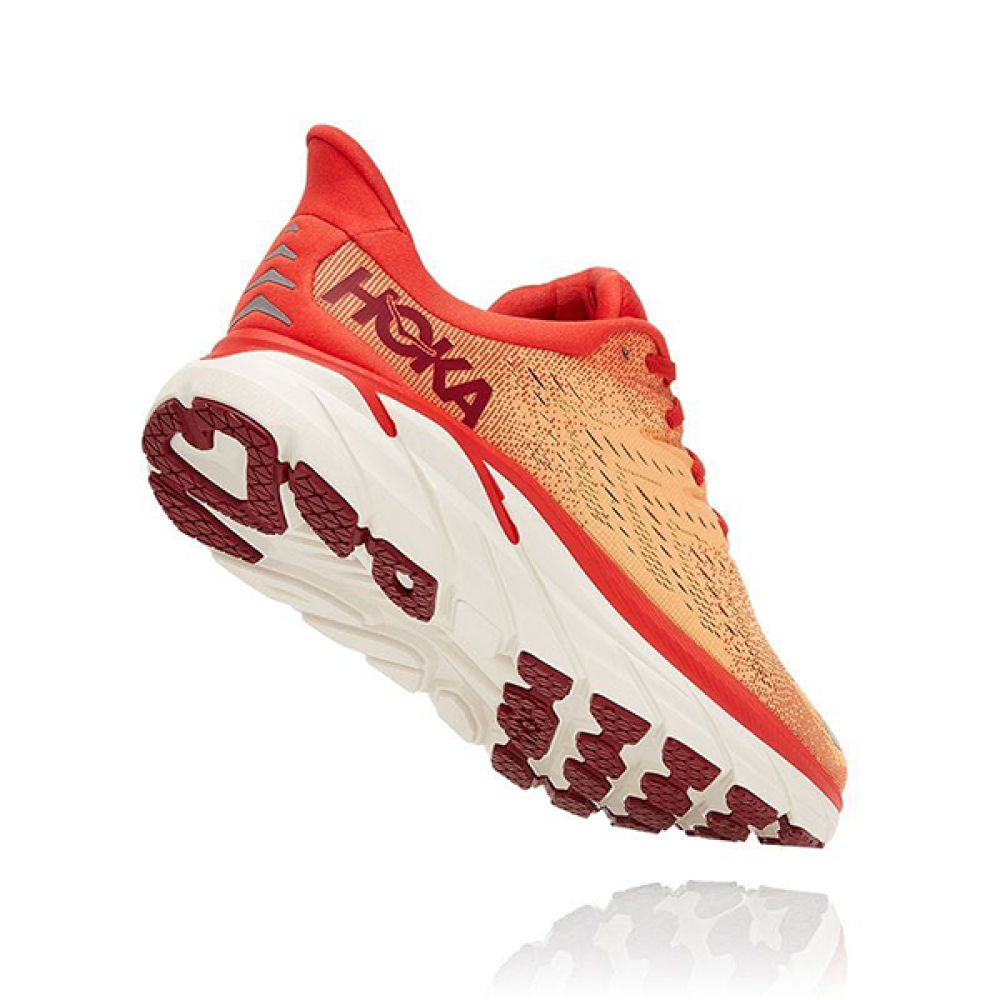 Elevate your athletic performance with the HOKA Clifton 8, a sneaker designed with a distinctive orange color that adds a touch of vitality and energy to every step you take.