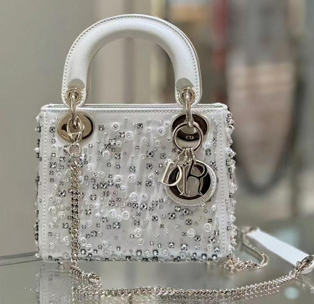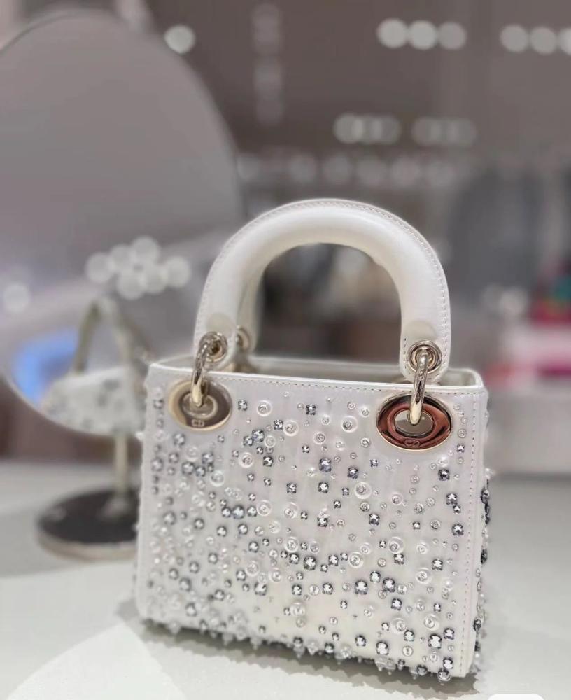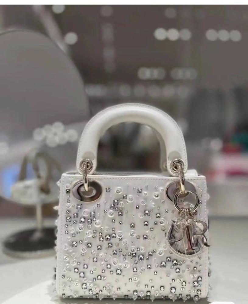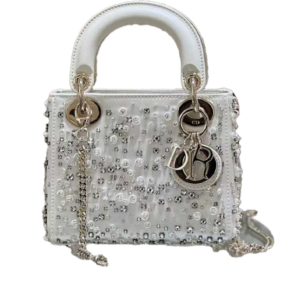Get the white Lady Dior mini bag with silver rhinestones now from eseven store , and give your look a touch of irresistible luxury.