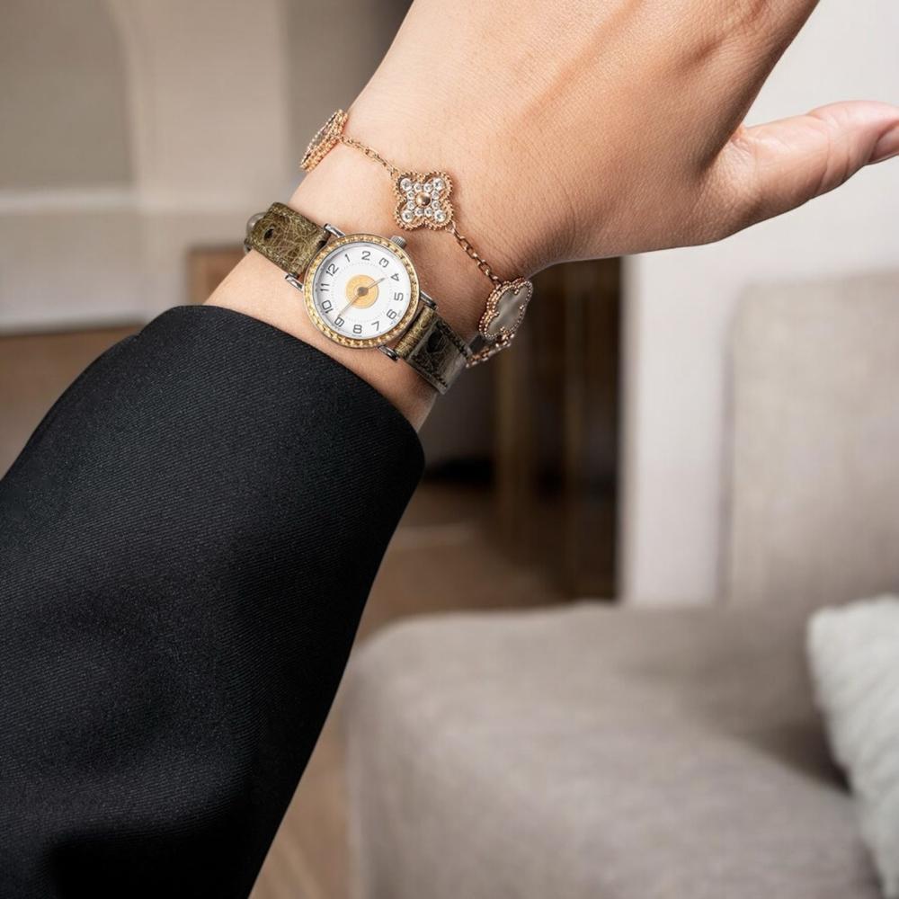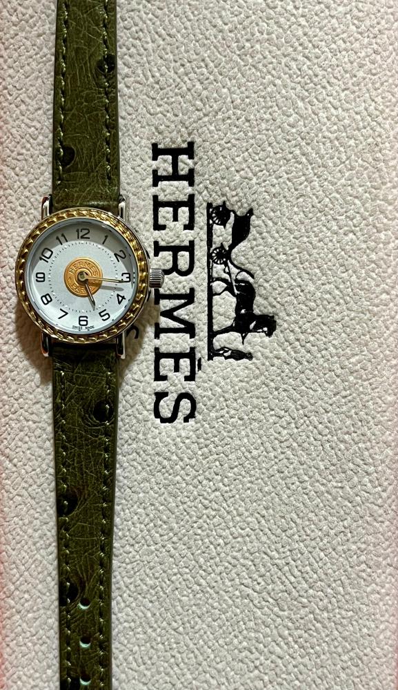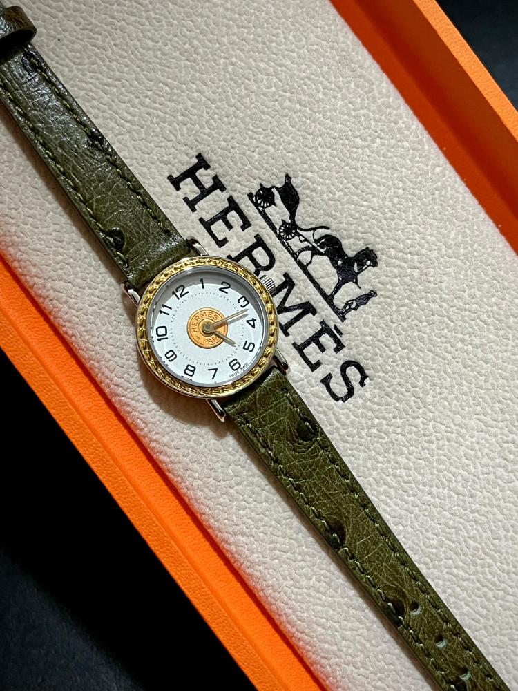 Hermes women's luxury leather watch in olive green with a round dial