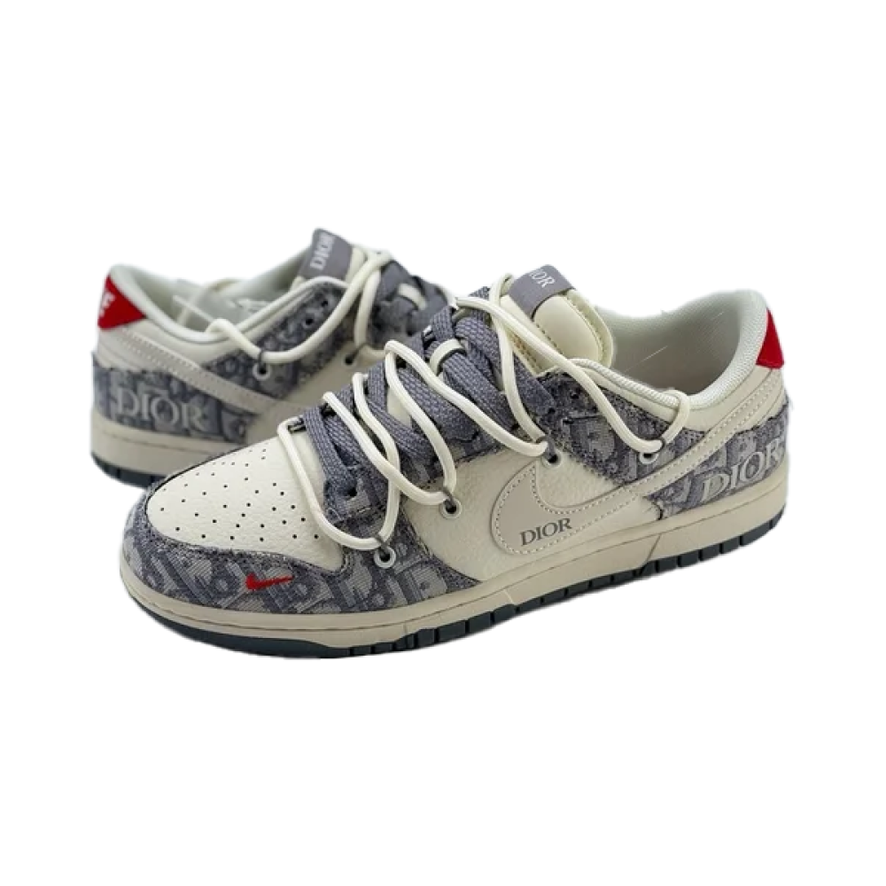 Discover luxury in every step with the Nike Dunk Low x Dior Oblique in grey and white.