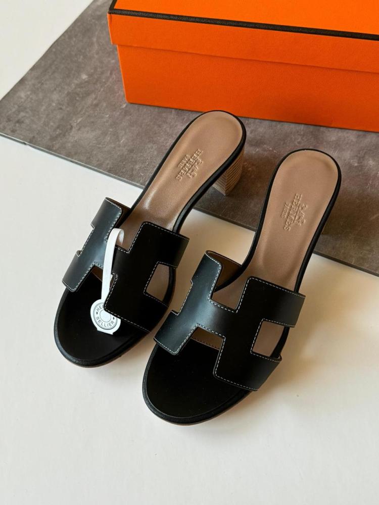 Enjoy elegance and comfort with these Hermes women's sandals crafted from smooth black leather, offering a touch of luxury with every step. Featuring a simple and elegant strapless design, these sandals offer comfort and flexibility. The beige sole adds balance and uniqueness to this sophisticated design, making them the perfect choice for both summer and casual looks.