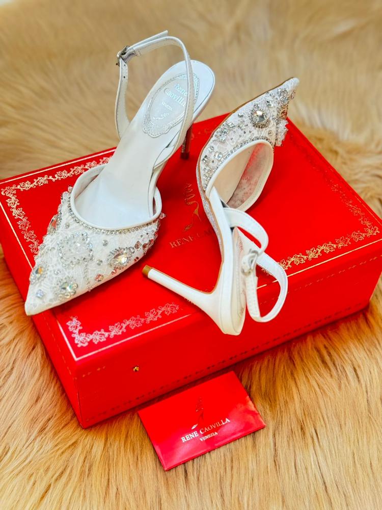 Enjoy absolute elegance with the René Caovilla women's slingback pumps with sparkling crystal details, in a pure white color that exudes luxury and distinction.